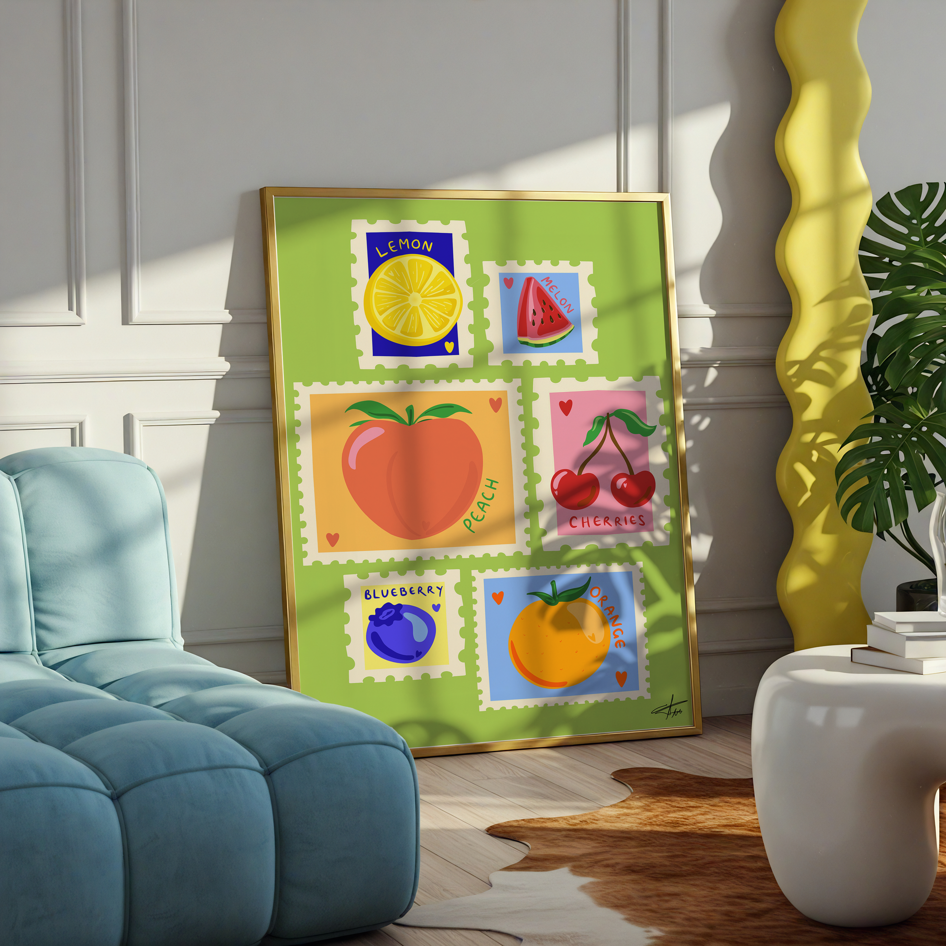 Add a pop of colour to your home with the Fruit Stamp series. Inspired by bright stamps and dopamine decor, this print features hand-illustrated stamps, each celebrating a different flavour, from sweet berries to spicy peppers and rich avocados.